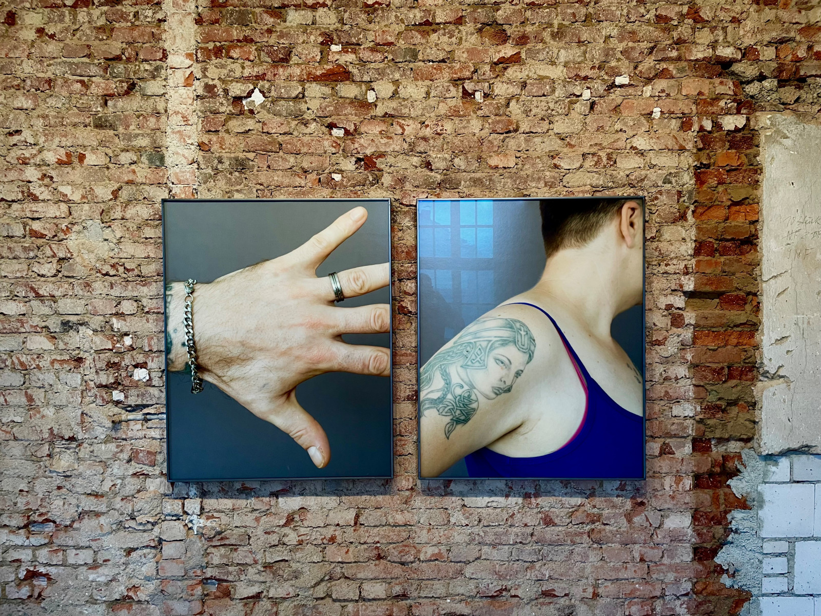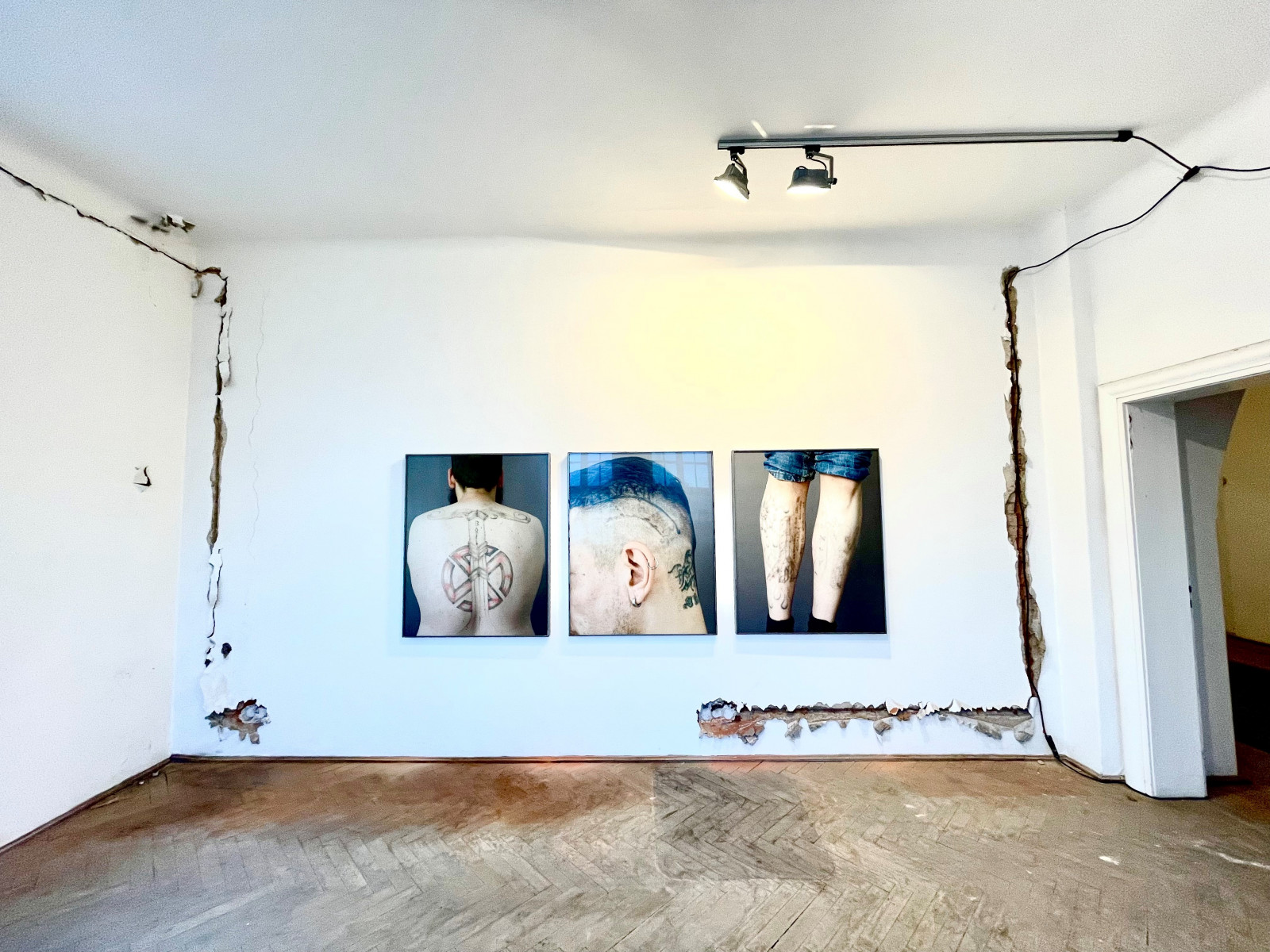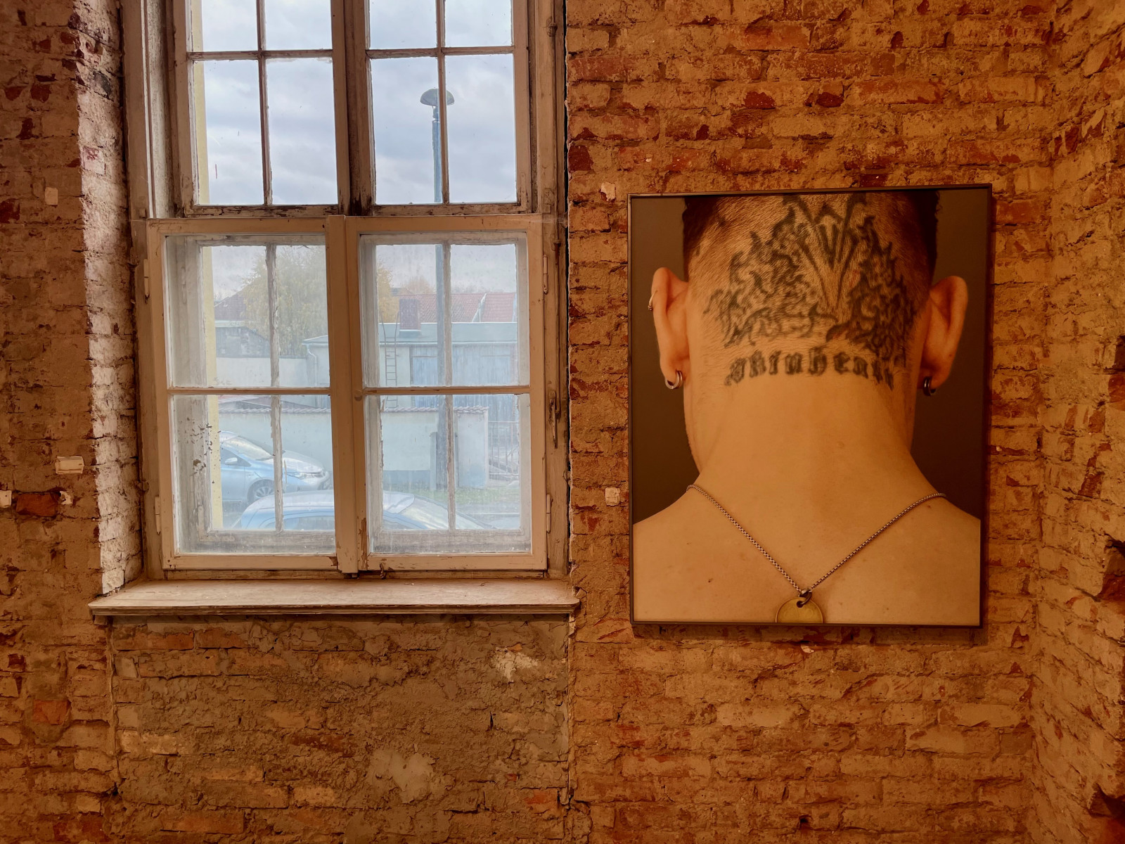 Die Ausstellung „Haut, Stein“ von Jakob Ganslmeier und EXIT-Deutschland rückt den Umgang mit nationalsozialistischen Symbolen in den Blick. Sie hinterfragt das Verbleiben, Verwenden und Verwischen einschlägiger Zeichen aus zwei Perspektiven: In Architektur und baulichen Ornamenten schreibt sich die Symbolik des Nationalsozialismus im öffentlichen Raum fort; als Tätowierungen dienen diese Zeichen dem individuellen Bekenntnis zum Rechtsextremismus.