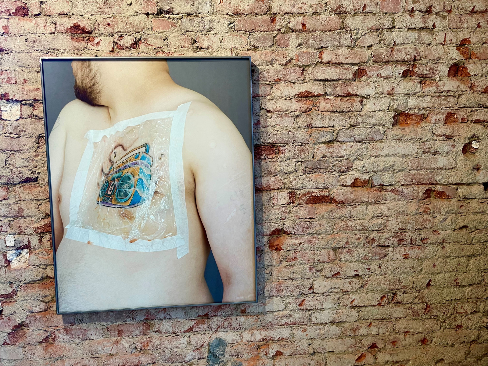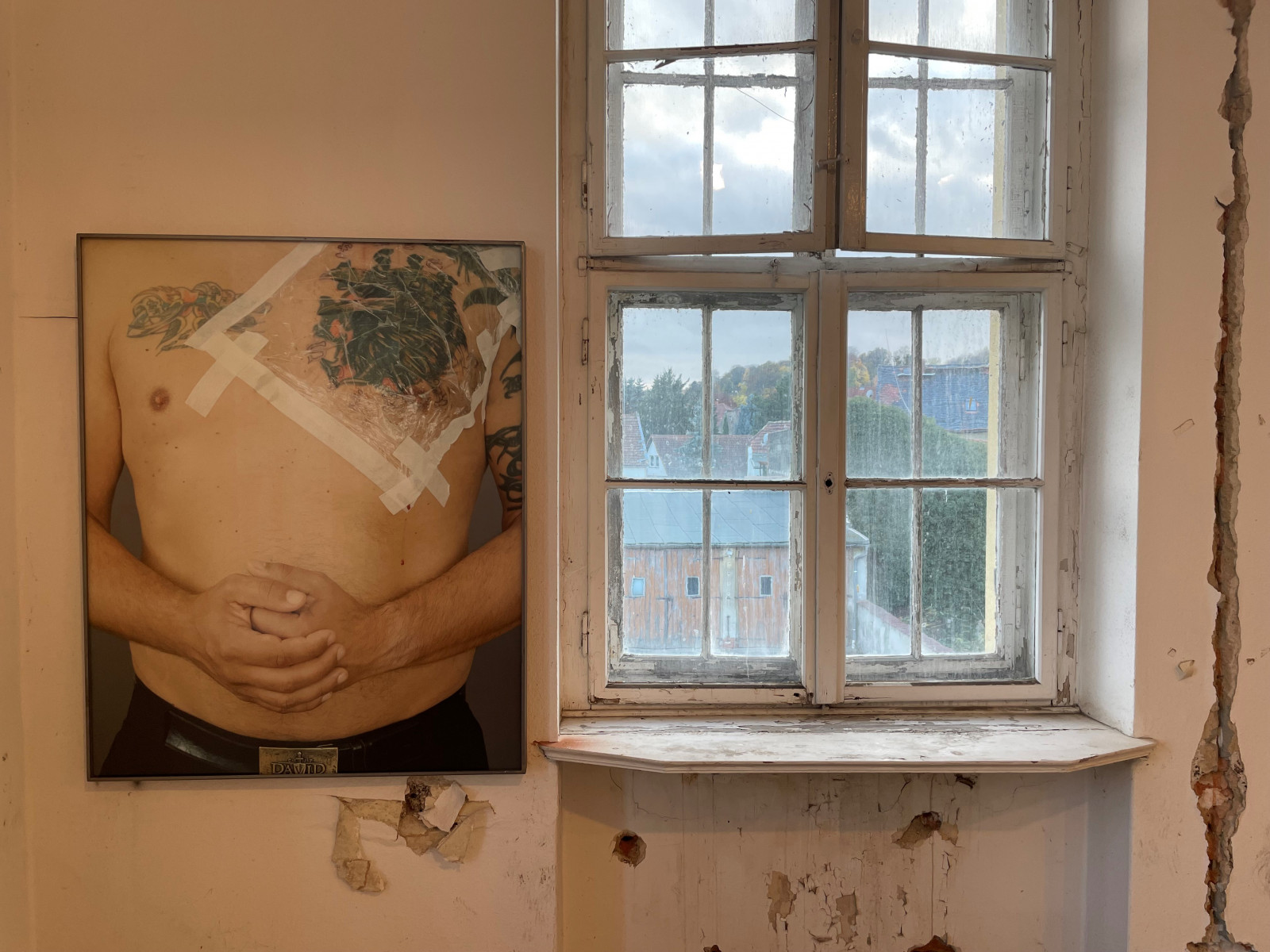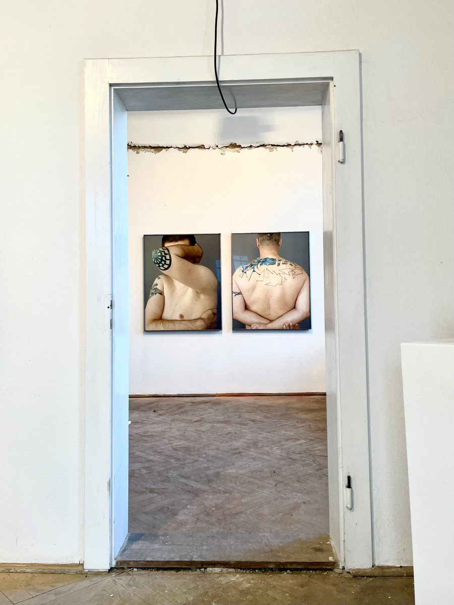 Die Ausstellung „Haut, Stein“ von Jakob Ganslmeier und EXIT-Deutschland rückt den Umgang mit nationalsozialistischen Symbolen in den Blick. Sie hinterfragt das Verbleiben, Verwenden und Verwischen einschlägiger Zeichen aus zwei Perspektiven: In Architektur und baulichen Ornamenten schreibt sich die Symbolik des Nationalsozialismus im öffentlichen Raum fort; als Tätowierungen dienen diese Zeichen dem individuellen Bekenntnis zum Rechtsextremismus.